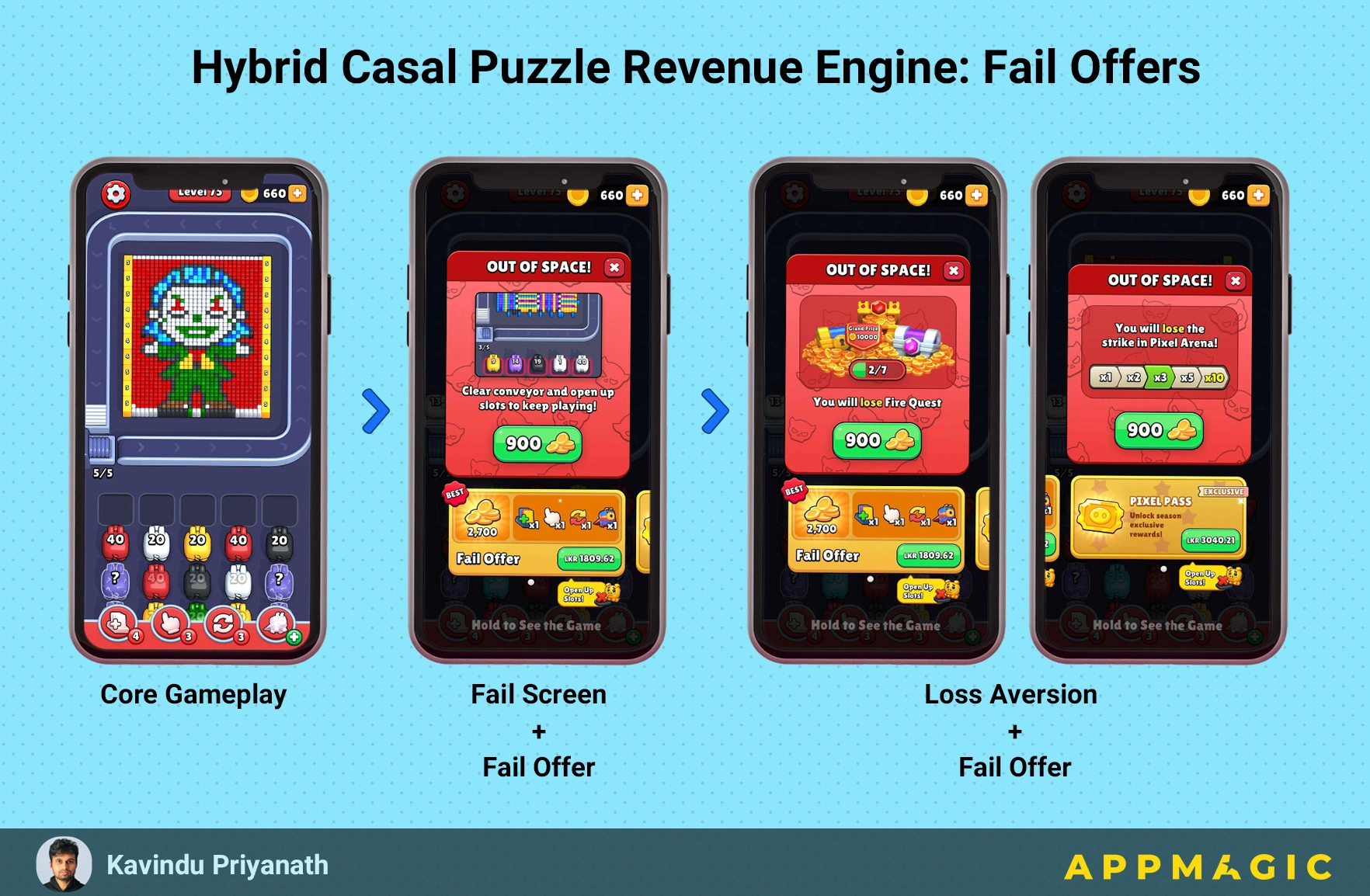 Fail offers don’t just let players to continue. They increase perceived value by bundling soft currency, boosters, extra time or additional space, giving players more reasons to convert.