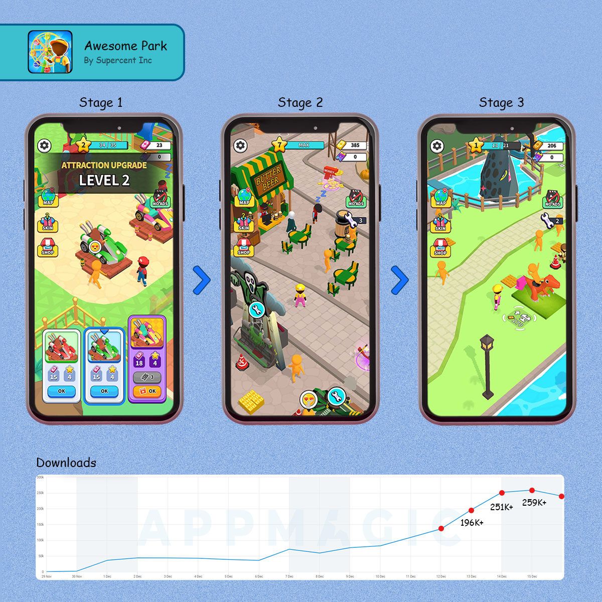Awesome Park is another Idle Arcade game published by Supercent Inc, and according to AppMagic, it is already achieving 200K+ daily downloads