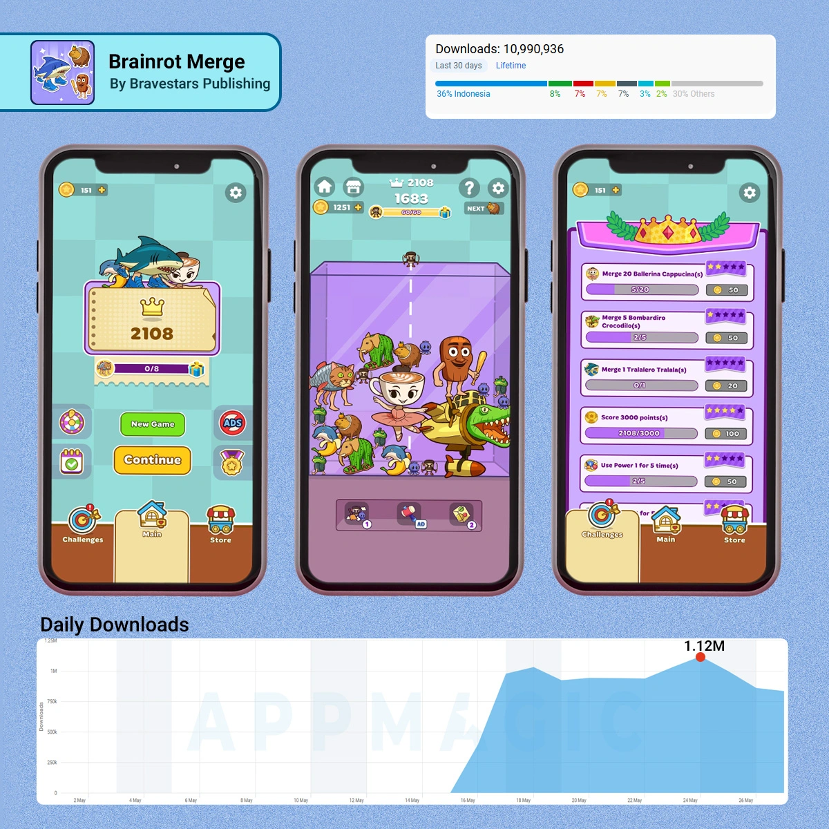 Brainrot Merge is a merge-2 game by Bravestars Publishing, released in 2023. And since May 2025, it has exploded with 900K+ daily downloads, even peaking over 1M, according to AppMagic.