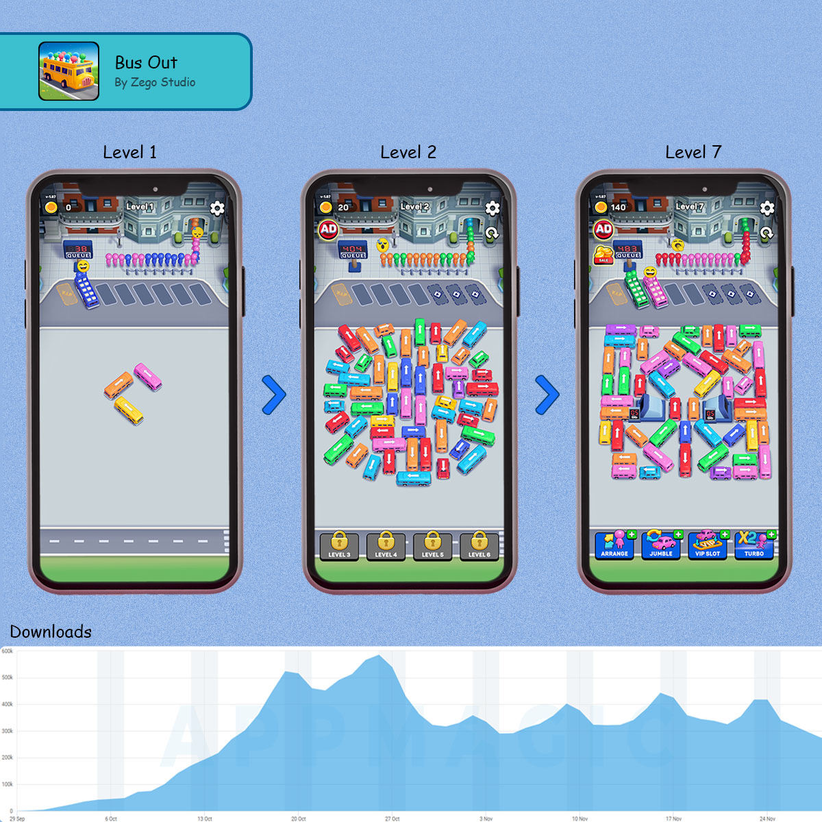 Bus Out a hype casual jam puzzle game by Zego Studio, was released on September 27, 2024, and it has been consistently achieving 250K+ daily downloads since October.