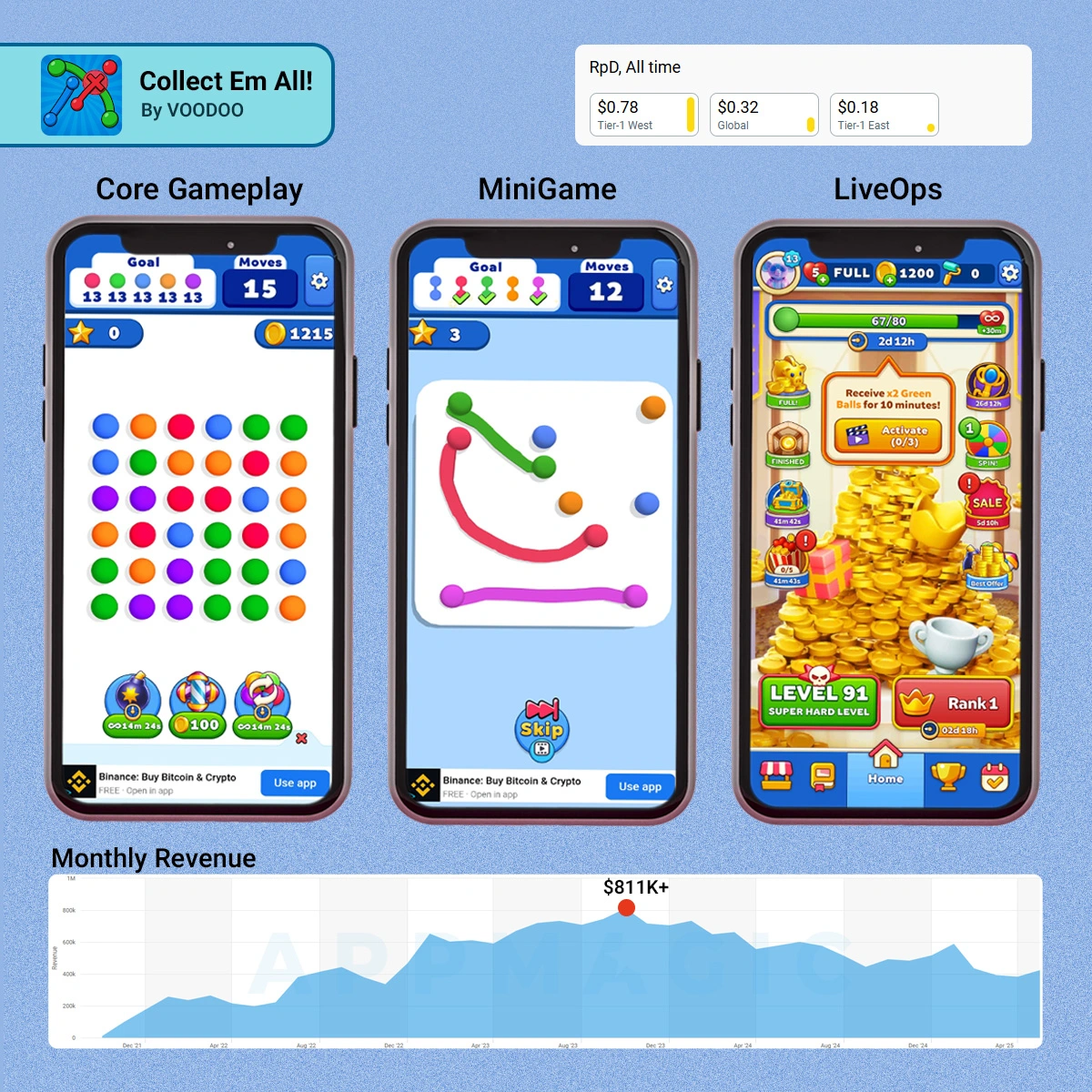 Collect Em All! is a chain puzzle game by Voodoo, released in September 2021, and it is still generating over $400K in monthly revenue from IAPs alone, according to AppMagic.