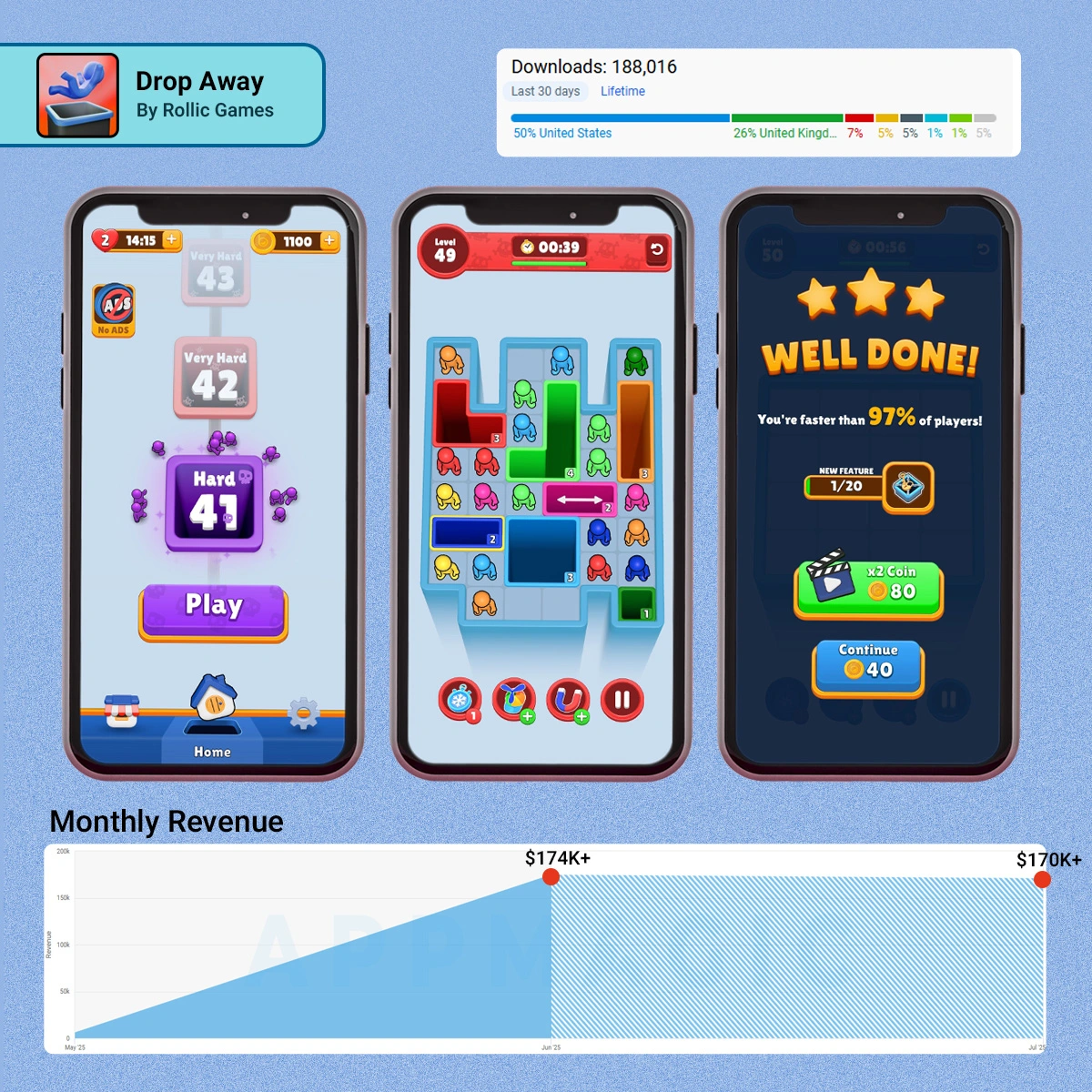 Drop Away is a hybrid casual sorting puzzle game released by Rollic Games in August 2024 and it is quietly gaining traction, with revenue already nearing last month’s $170K mark by mid-month, according to AppMagic.