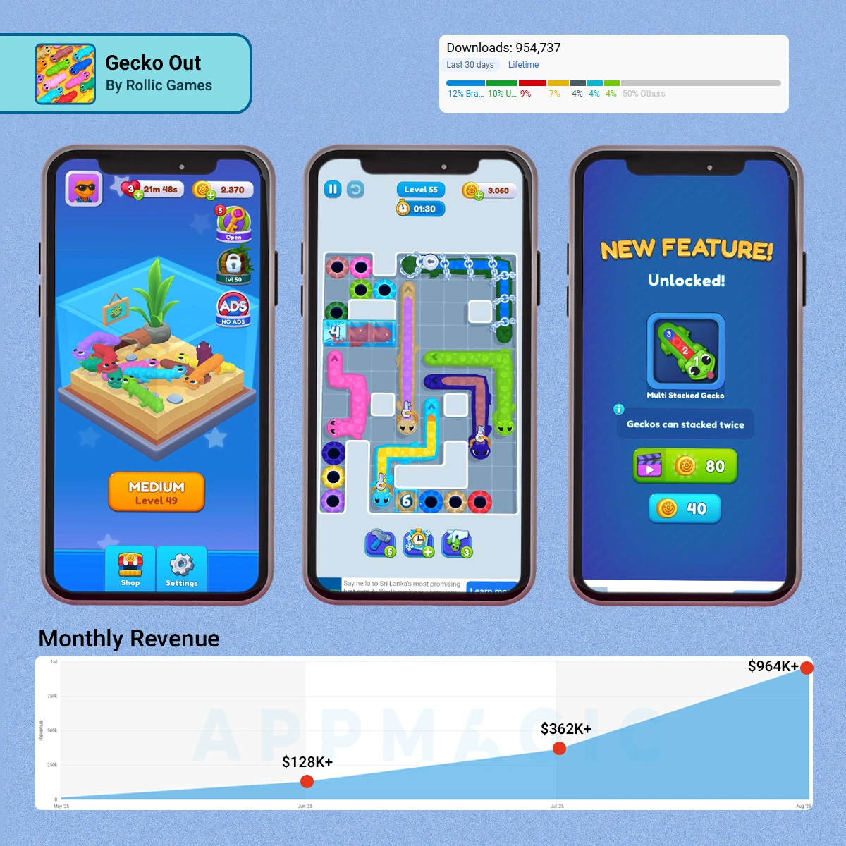 Gecko Out is a hybrid casual block puzzle game by Rollic Games, released in March 2025, and it is already making $900K+ per month in IAP revenue, according to AppMagic.