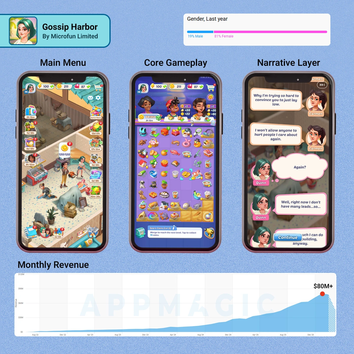 Gossip Harbor is a merge-2 casual puzzle game by Microfun, released in July 2022, and it has exceeded $3M+ in daily IAP revenue, according to AppMagic.