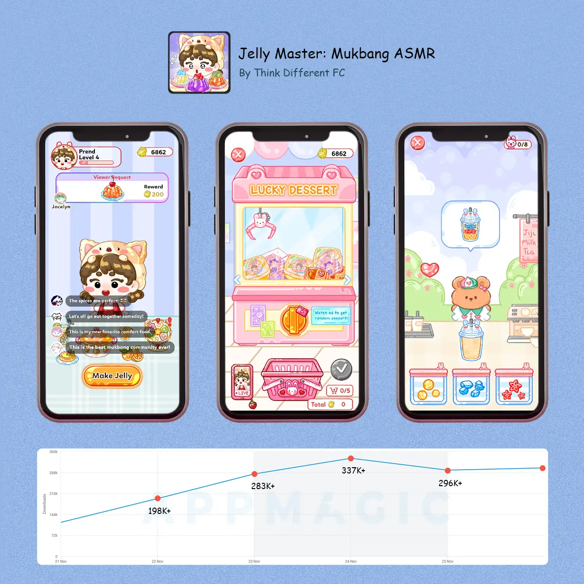 Jelly Master is a mukbang live-streaming simulation game by Think Different FC, released on October 30, 2024. Over the past seven days, the game has been amassing 100K+ daily downloads, even peaking at 300K+ in a single day.