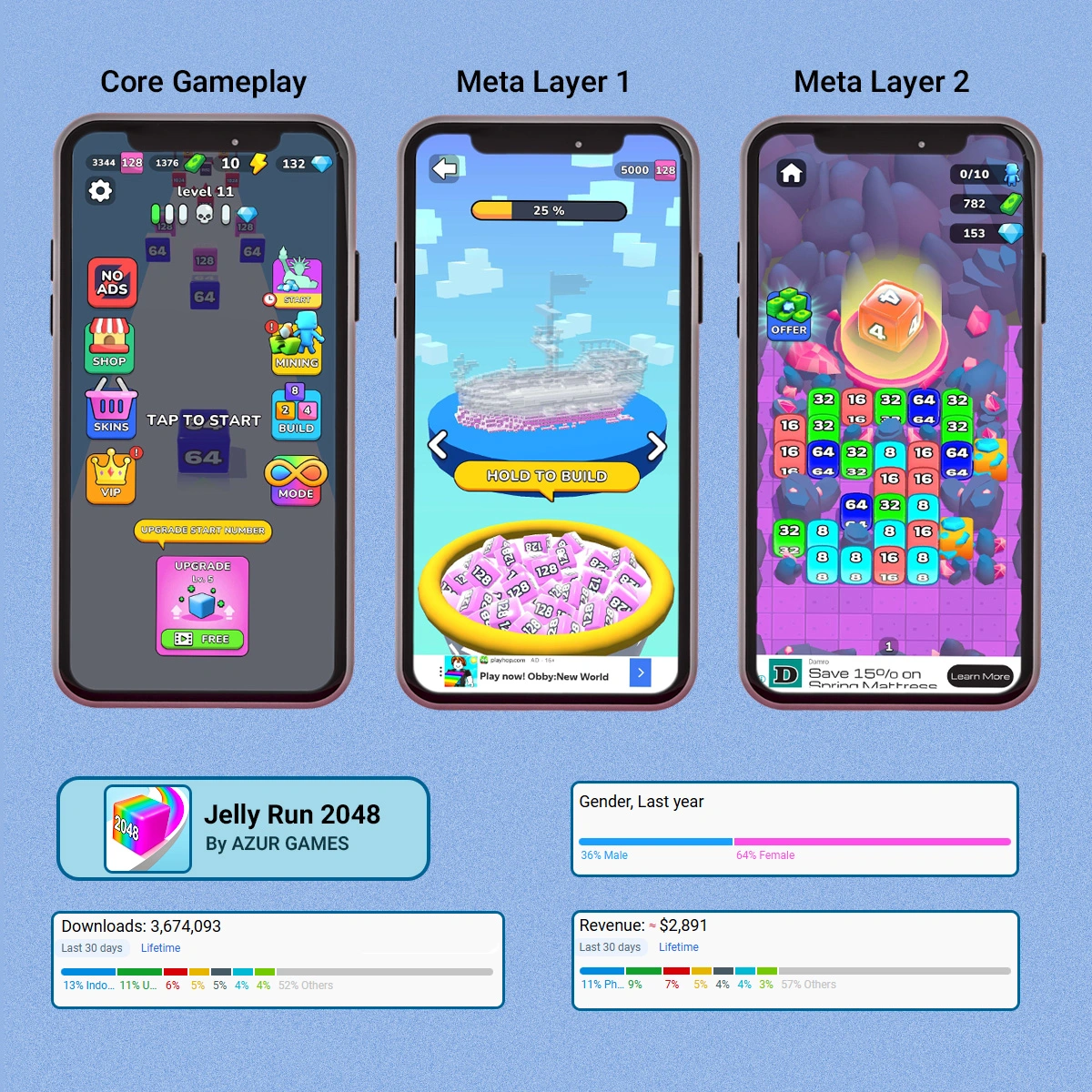 Jelly Run 2048 is a hypercasual runner by Azur Games, launched in 2021 and it has scaled to over 3M+ monthly downloads, continuing to grow well beyond the peak of the hypercasual era, according to AppMagic.