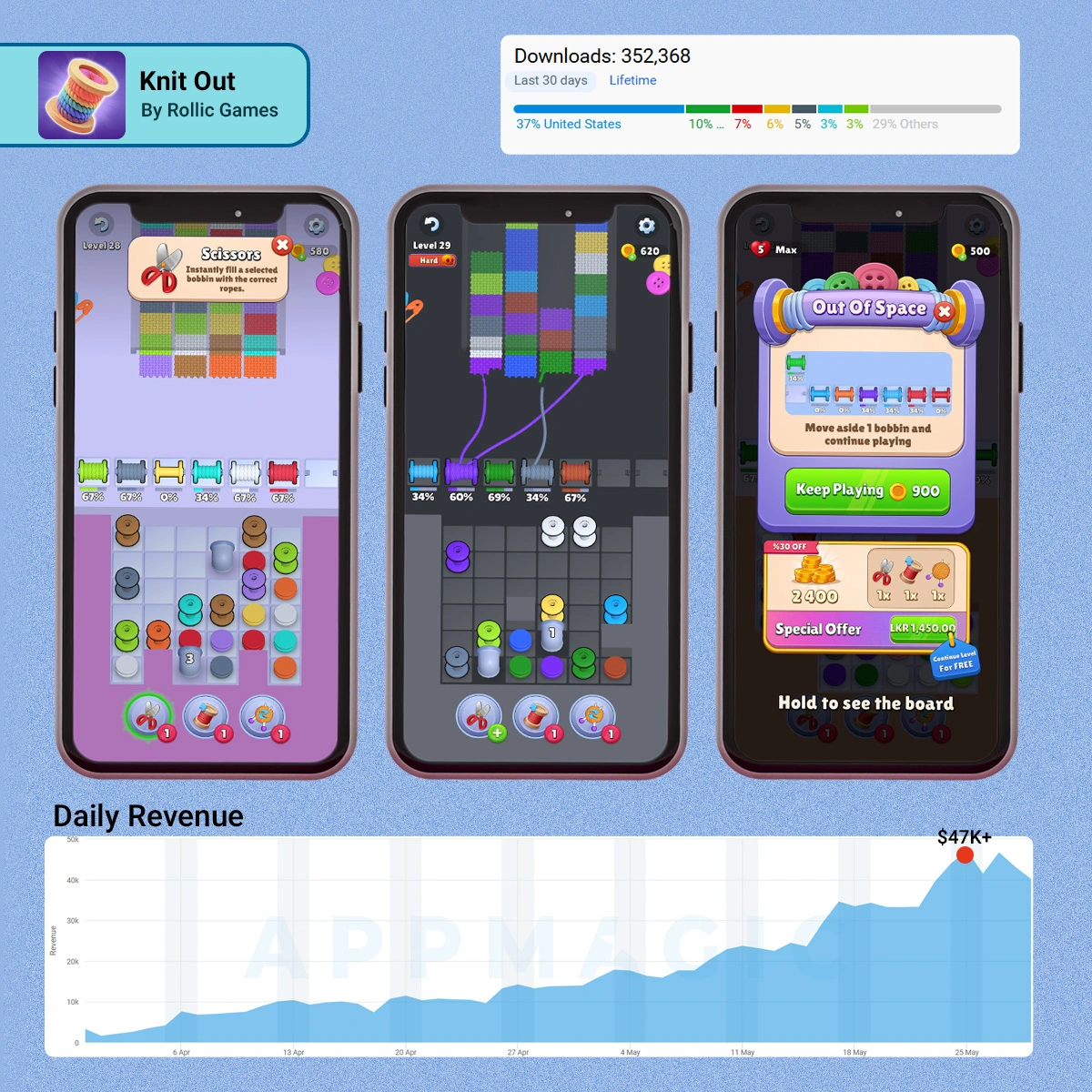 Knit Out is a sort-puzzle hybridcasual game by Rollic Games, released in January 2025, and it has recently scaled up to generating over $40K in daily revenue from IAPs alone, with only 15K-20K daily downloads.