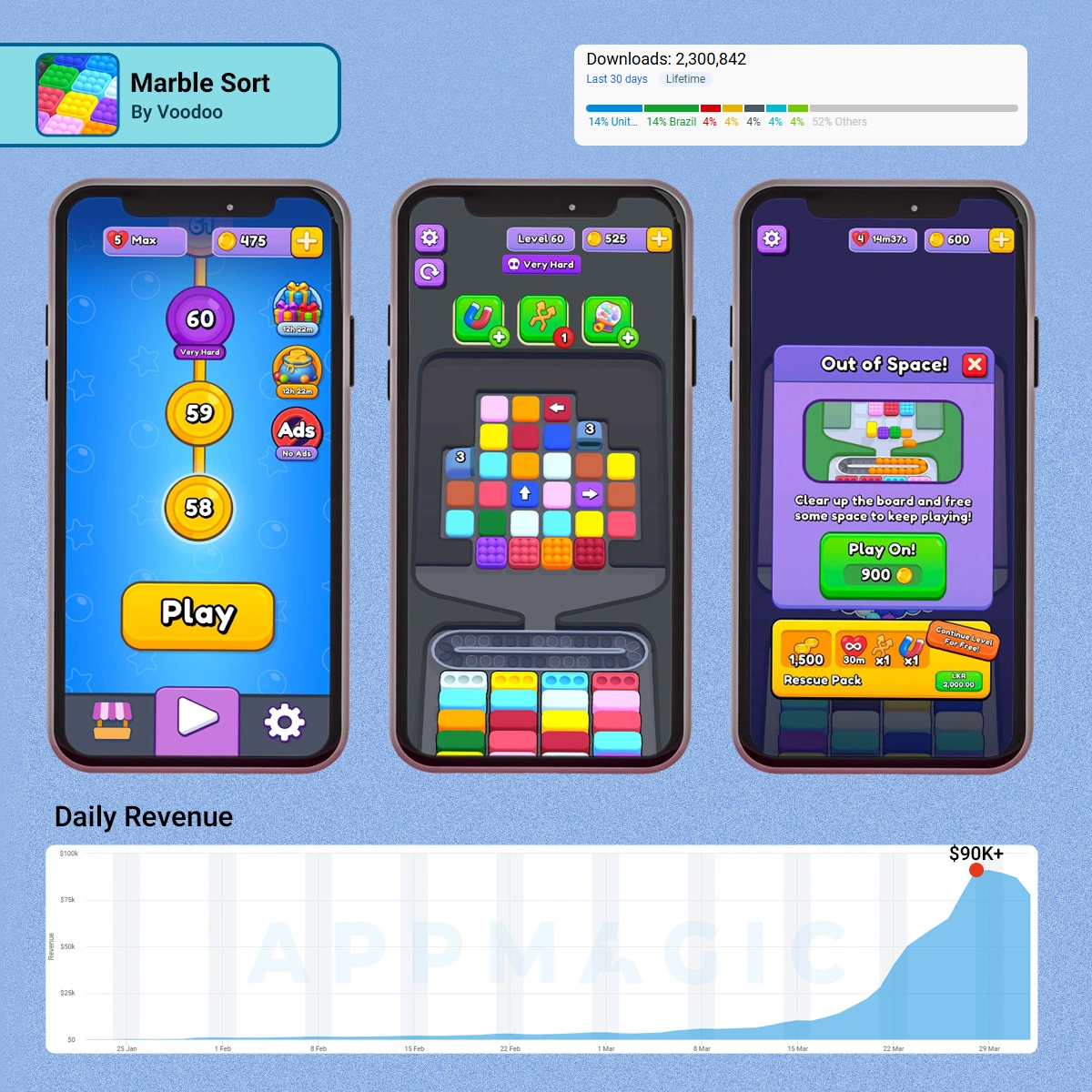 Marble Sort is a sort puzzle game by Voodoo, released in October 2025, and it has scaled to over $60K in daily IAP revenue, according to AppMagic.