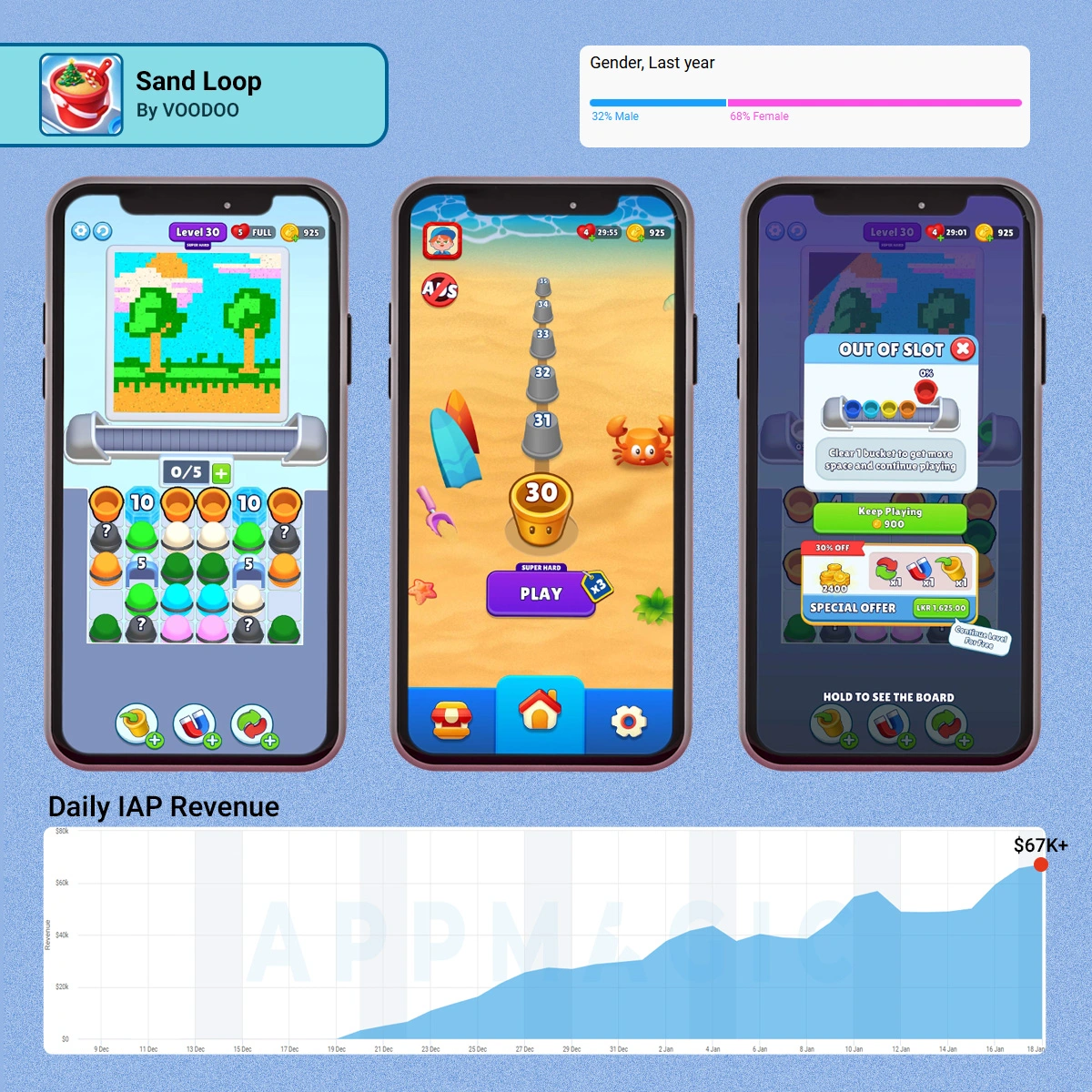 Sand Loop is a sort puzzle game by Voodoo, released in October 2025, and it has already scaled to $60K+ in daily IAP revenue according to AppMagic.