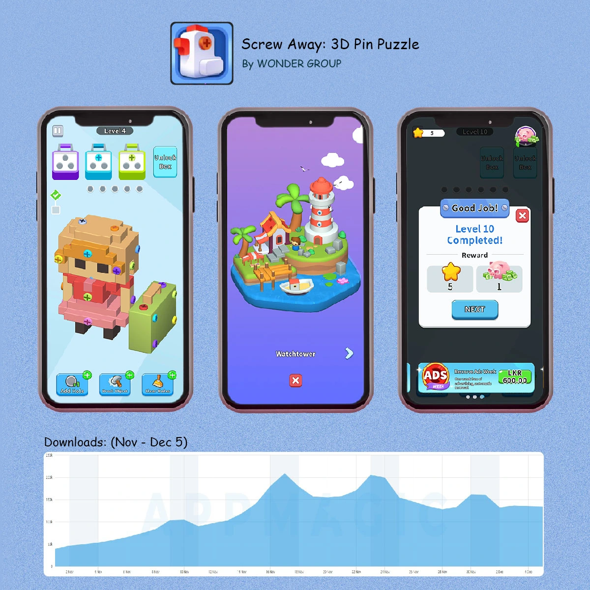 Screw Away is a hybrid casual puzzle game, released on July 19, 2024 by Wonder Group and it has been doing 100K+ daily downloads since November, even surpassing 200K downloads on some days.