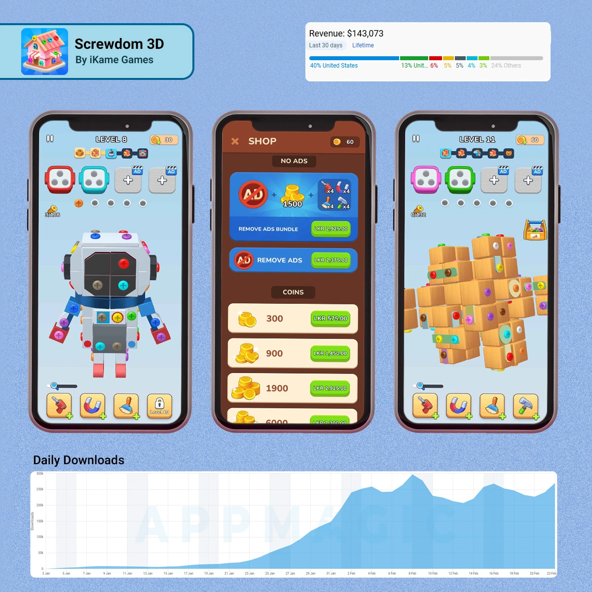 Screwdom 3D is a hypercasual screw puzzle game by iKame Games, released on December 18, 2024 and it has rapidly scaled up, exceeding 200K+ daily downloads according to AppMagic