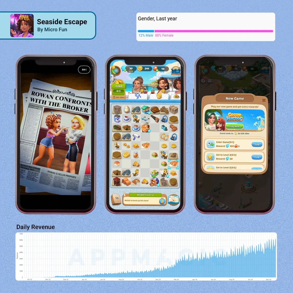 Seaside Escape is a merge-2 puzzle game released by Micro Fun on November 24, 2022 and it has scaled to generate over 600K in daily revenue from IAPs, according to AppMagic.