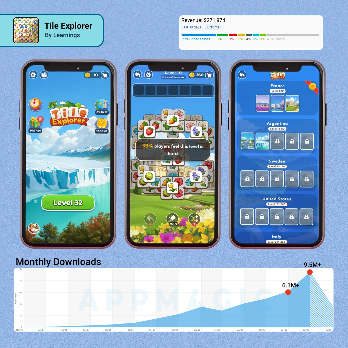 Tile Explorer is a Match-3 tile puzzle game released by Learnings in May 2024, and it has scaled to over 9M monthly and 500K+ daily downloads, according to AppMagic.