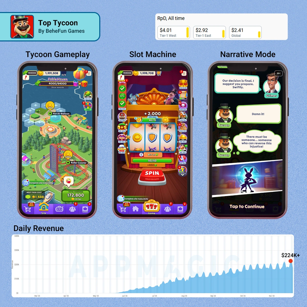 Top Tycoon is a casual coin looter game by BeheFun Games, released in March 2025 and it has scaled to $170K+ in daily IAP revenue, with consistent weekend spikes crossing $200K.