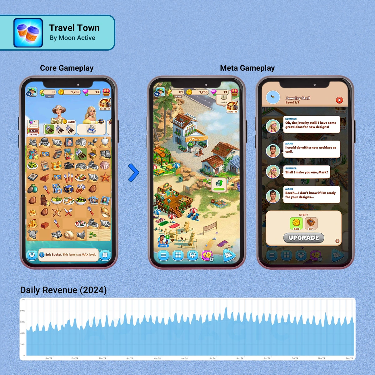 Travel Town is a merge-2 casual puzzle game by Moon Active, released on February 12, 2021. According to AppMagic, it has managed to consistently achieve $400K+ in daily revenue over the last year