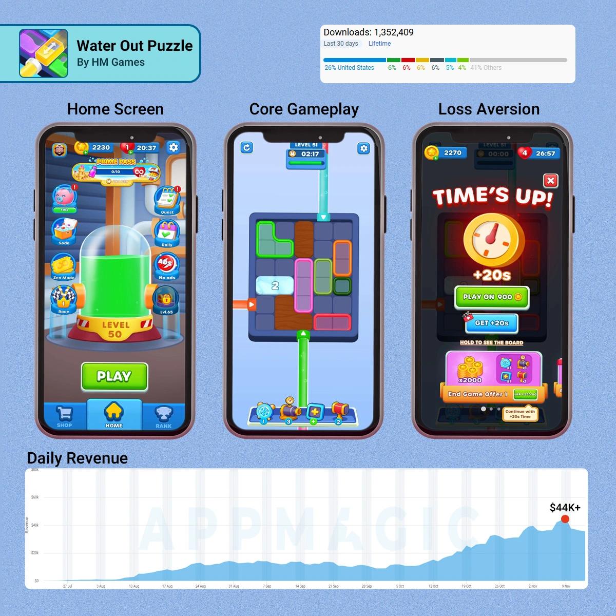 Water Out Puzzle is a hybricasual block puzzle by HM Games, released in July 2025 and it has already scaled impressively generating over $40K in daily IAP revenue, according to AppMagic.