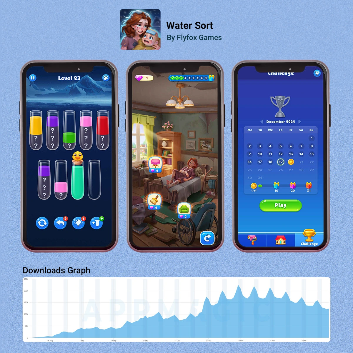 Water Sort by Flyfox Games was released on July 31, 2024 and it has been attracting 100K+ daily downloads since October, according to AppMagic